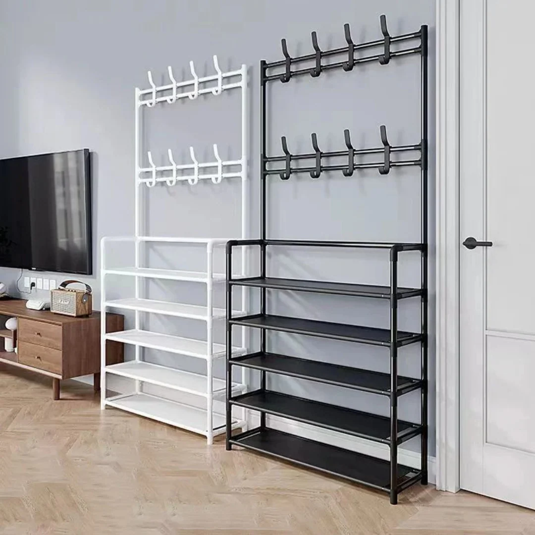 يجمع هذا الرف بين **أرفف متعددة لتخزين الأحذية** و**خطافات علوية قوية** لتعليق المعاطف، القبعات، الحقائب، والمفاتيح. وداعاً لتناثر الأغراض، ومرحباً بالترتيب المثالي في مدخل منزلك أو غرفتك.